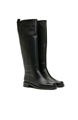 Siyah Kadın Küt Burun Topuklu Deri Çizme
