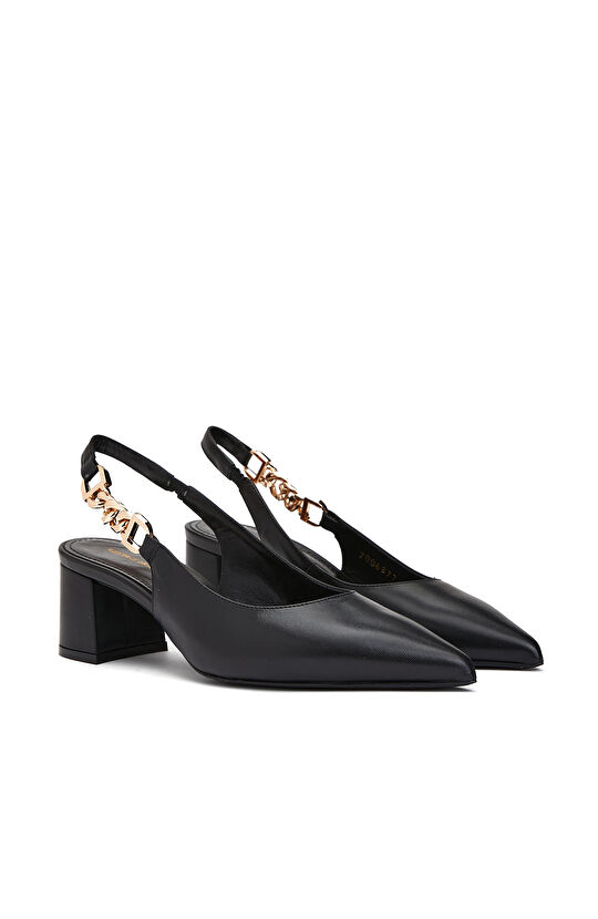 Siyah Kadın Deri Küt Burun Topuklu Ayakkabı