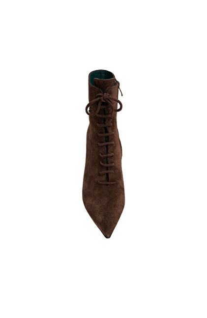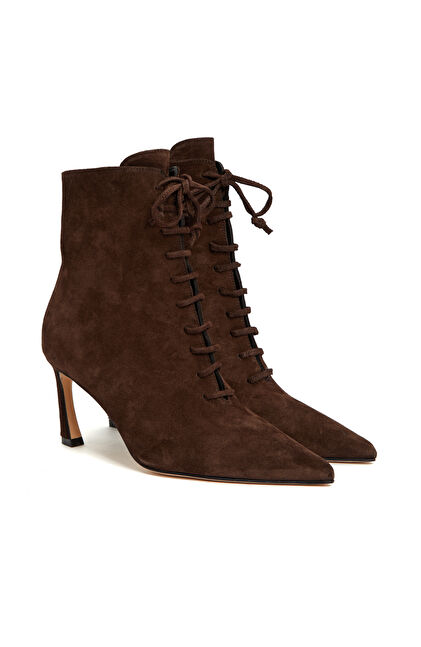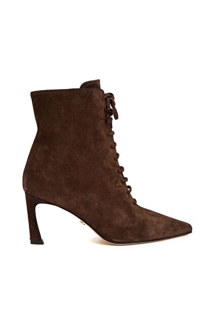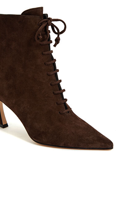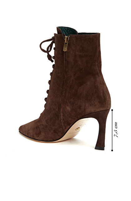 Kahverengi Kadın Bağcıklı Topuklu Süet Deri Bot