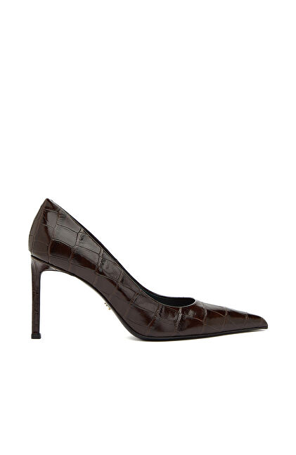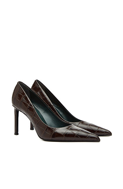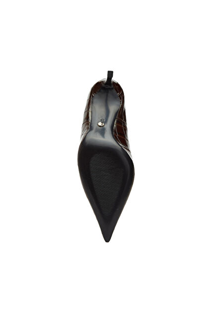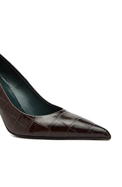 Kahverengi Kroko Desenli Kadın Deri Topuklu Ayakkabı