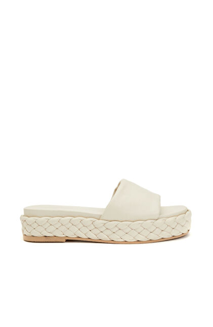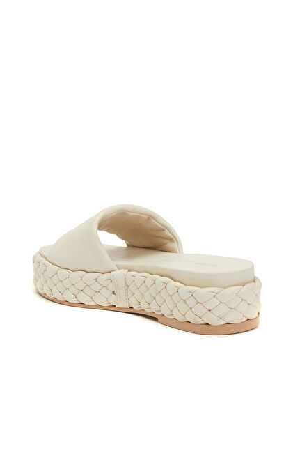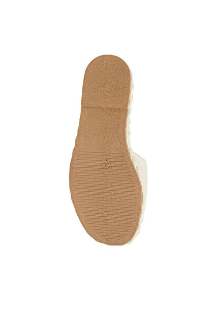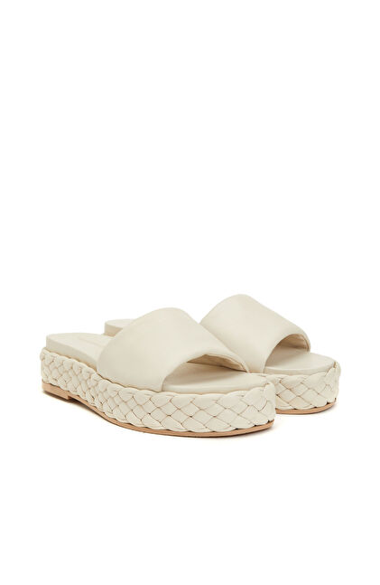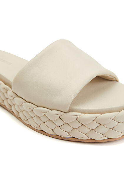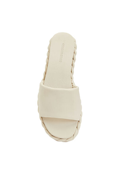 Kırık Beyaz Örgü Detaylı Kadın Deri Terlik