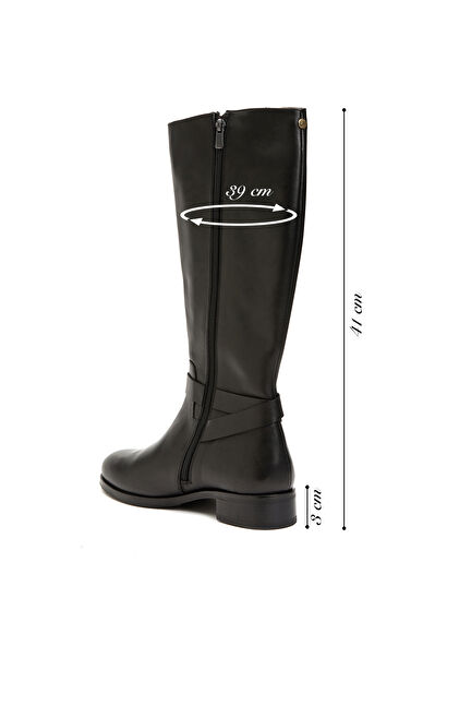 Yuvarlak Burun; Fermuar Kapatmalı; Deri Çizme; Kauçuk Tabanlı; Kemer Detaylı; Topuk 3 cm; Baldır Genişliği: 39 cm'dir;Hayvansal Kökenli Tekstil Dışı Parçalar İçerir;Baldır Genişliğinde 40 Beden Referans Alınmıştır;Diğer bedenlerde +/- 3 cm fark göstermektedir.,