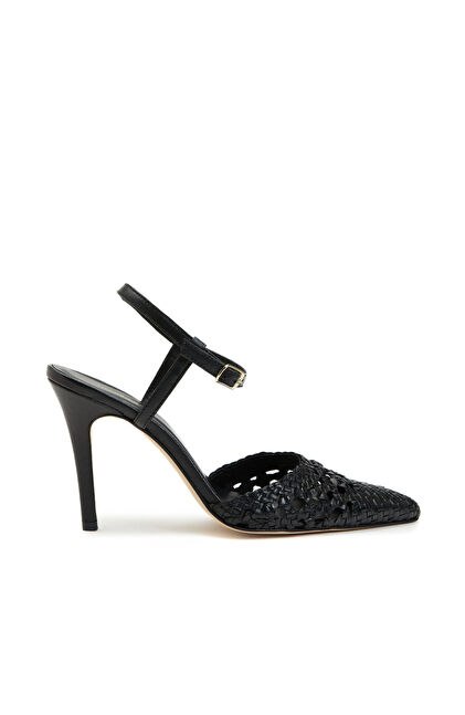 Sivri Burun; Hasır Desenli; Deri Sandalet. Bantlı; Kösele Tabanlı; Yüksek Ökçeli. Topuk: 10 cm,