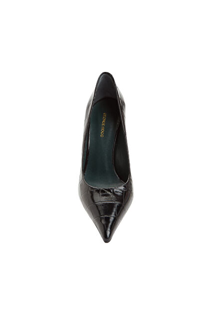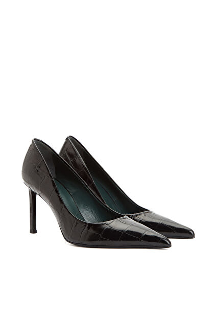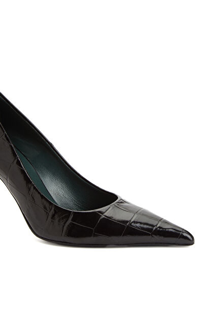 Siyah Kroko Desenli Kadın Deri Topuklu Ayakkabı