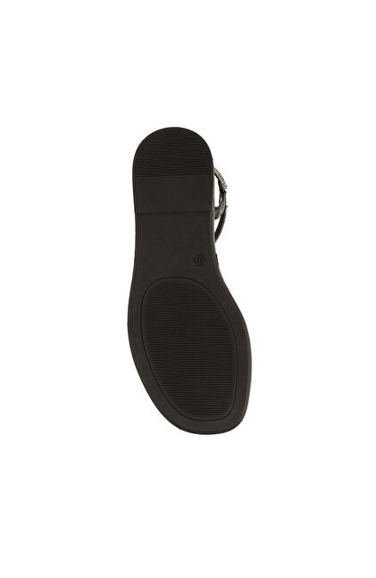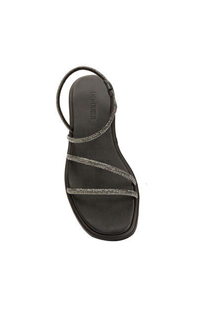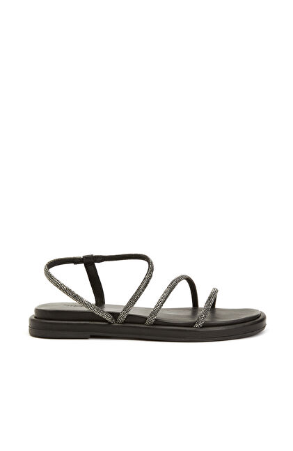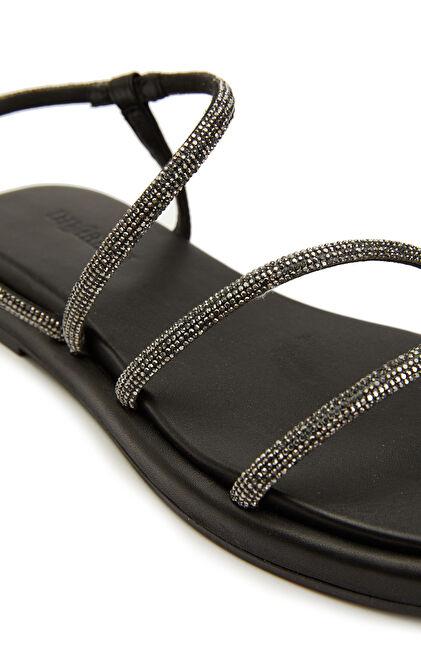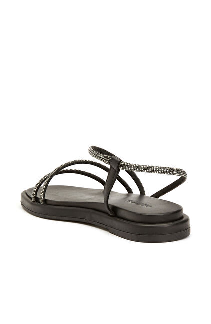 Siyah Taş Bantlı Kadın Deri Sandalet