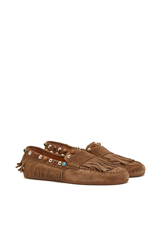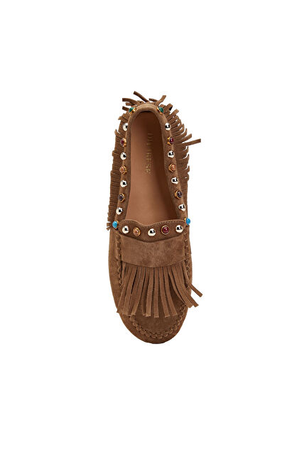 Tütün Taşlı Püsküllü Kadın Süet Loafer